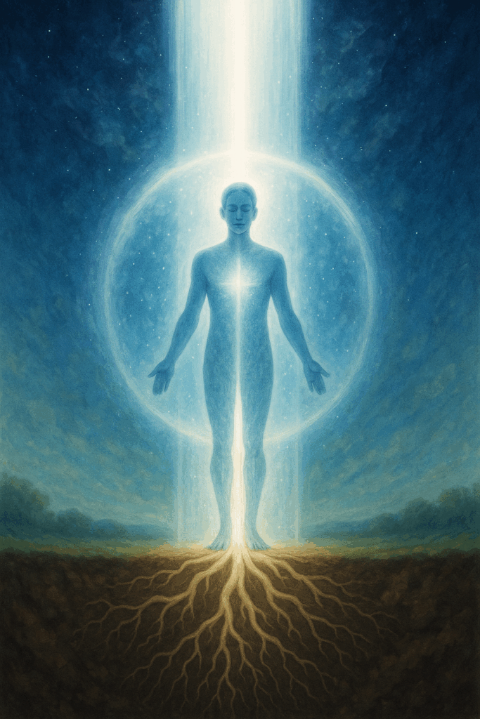 Imagine your legs are growing roots from the bottom of your feet that reach deep in the earth just like a large Oak tree. These roots are flexible and pliable, so when you lift your feet, the roots follow you. Then visualize a cord of white light starting at your root chakra and extending deep into the earth. Embody this feeling.